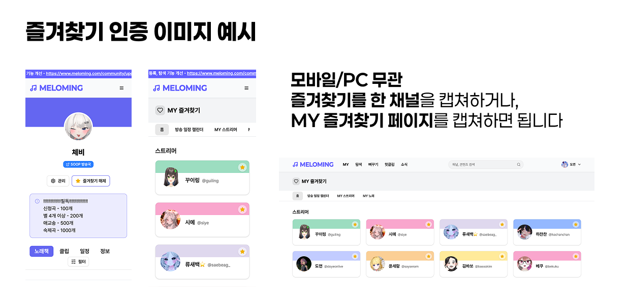 - 멜로밍에서 마음에 드는 '채널 즐겨찾기'를 1개 이상 눌러주세요.