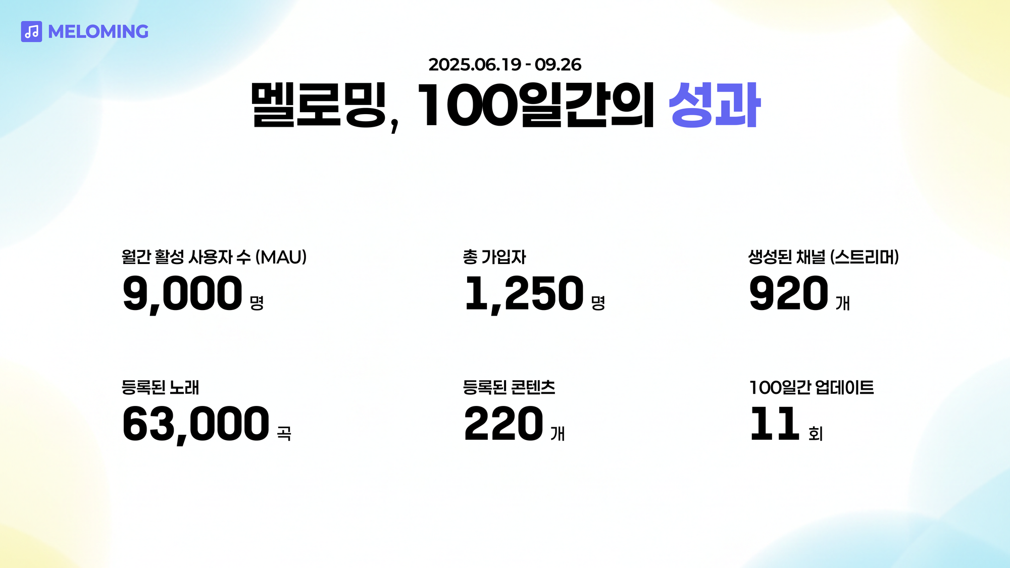 멜로밍은 지난 100일 동안 11차례의 업데이트를 진행하며, 총 가입자수 1,250명, 월간 활성 사용자수 (MAU) 9,000명을 달성하였고, 특히 핵심 기능인 노래책에 등록된 노래는 63,000곡을 돌파했습니다.
