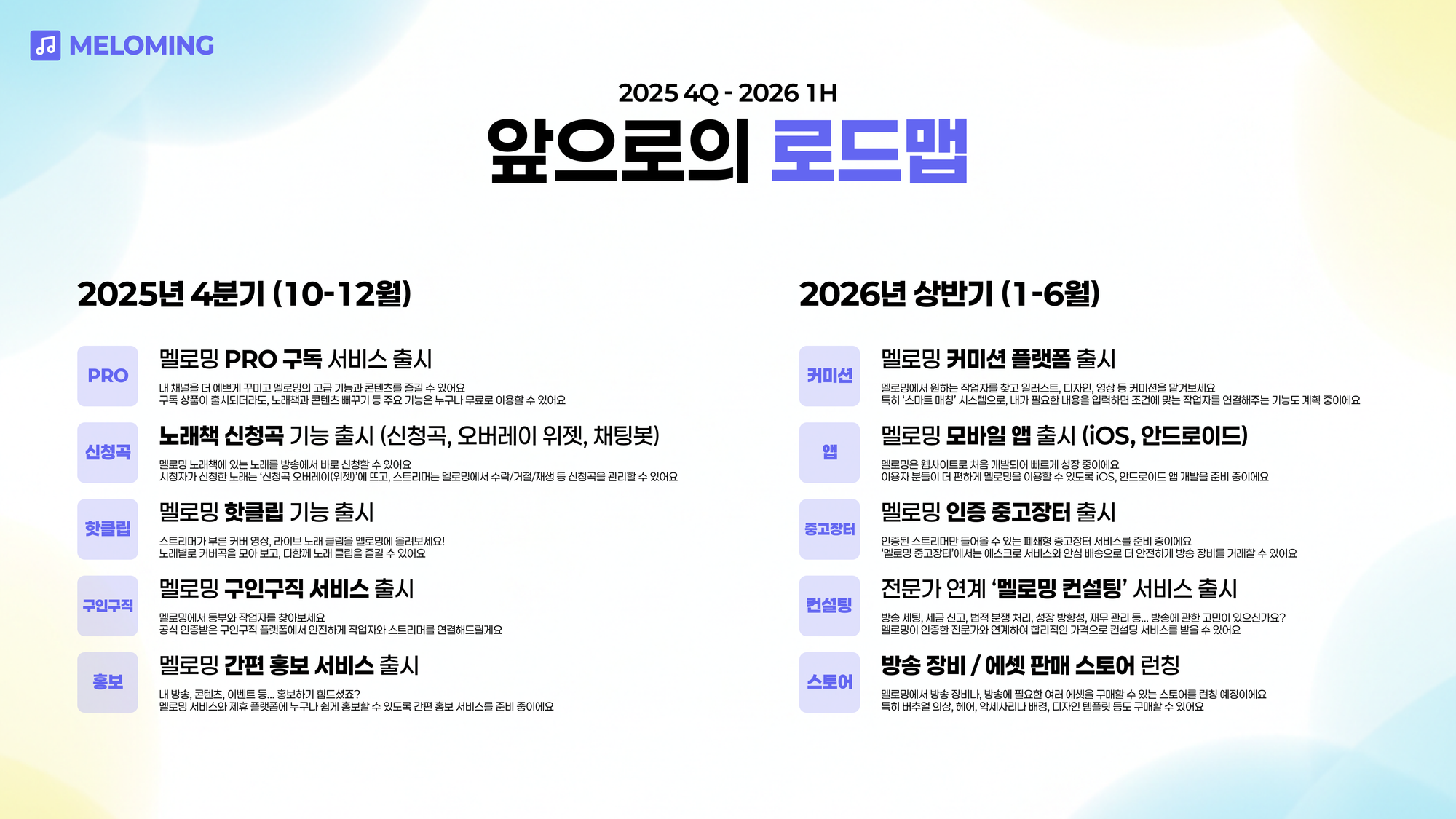 멜로밍 100일을 맞아, 멜로밍 팀에서는 지금까지의 성과를 되돌아보고, 앞으로의 로드맵과 비전을 공개하는 자료를 준비하였습니다.