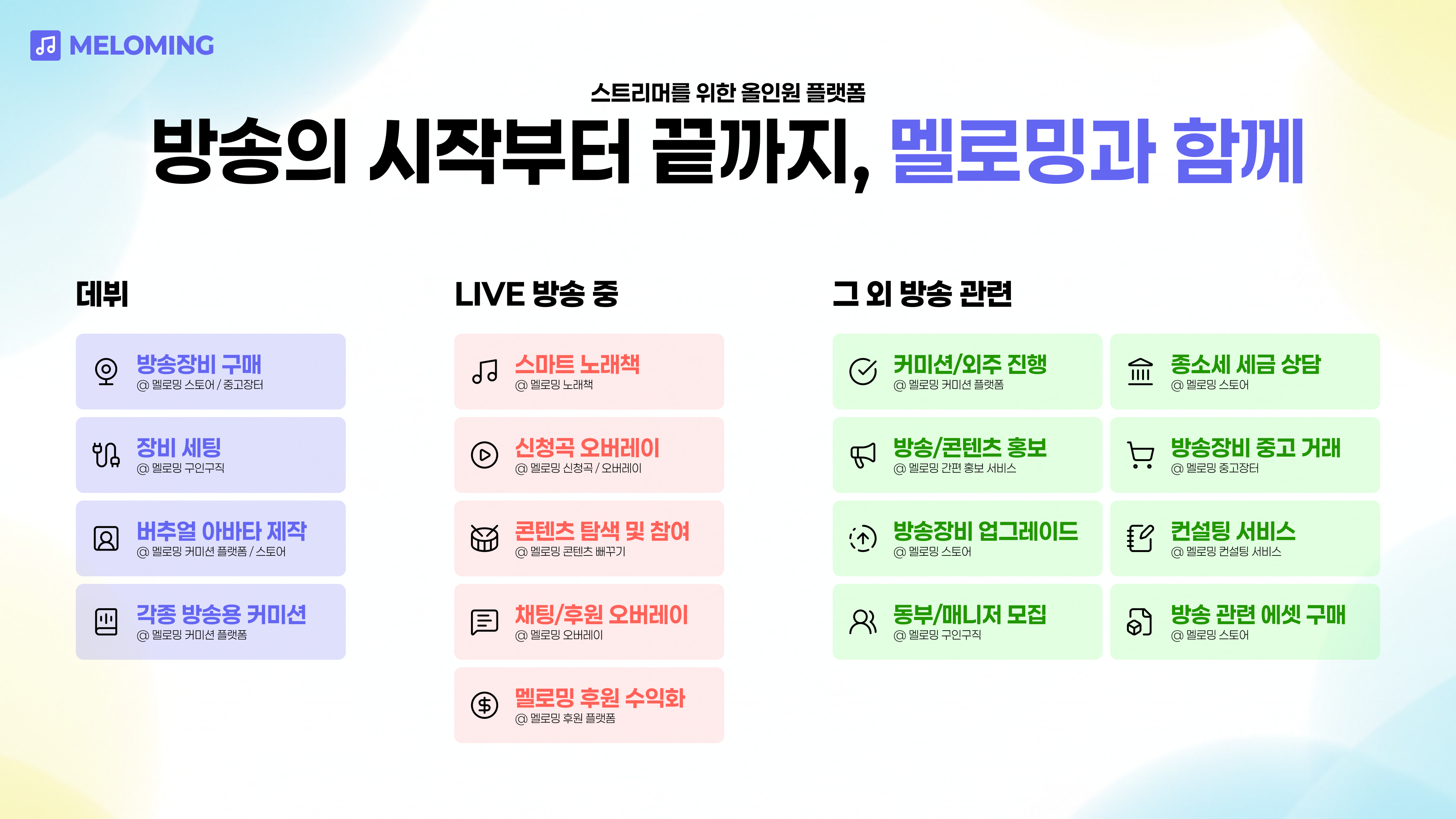 저희는 '방송의 시작부터 끝까지 멜로밍이 함께한다' 는 모토 아래, 구인구직/커미션/스토어/중고장터/컨설팅 등 방송과 관련된 주요 기능들을 멜로밍 안에서 한 번에 해결할 수 있는 생태계를 구축하고자 합니다.