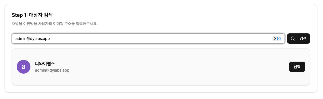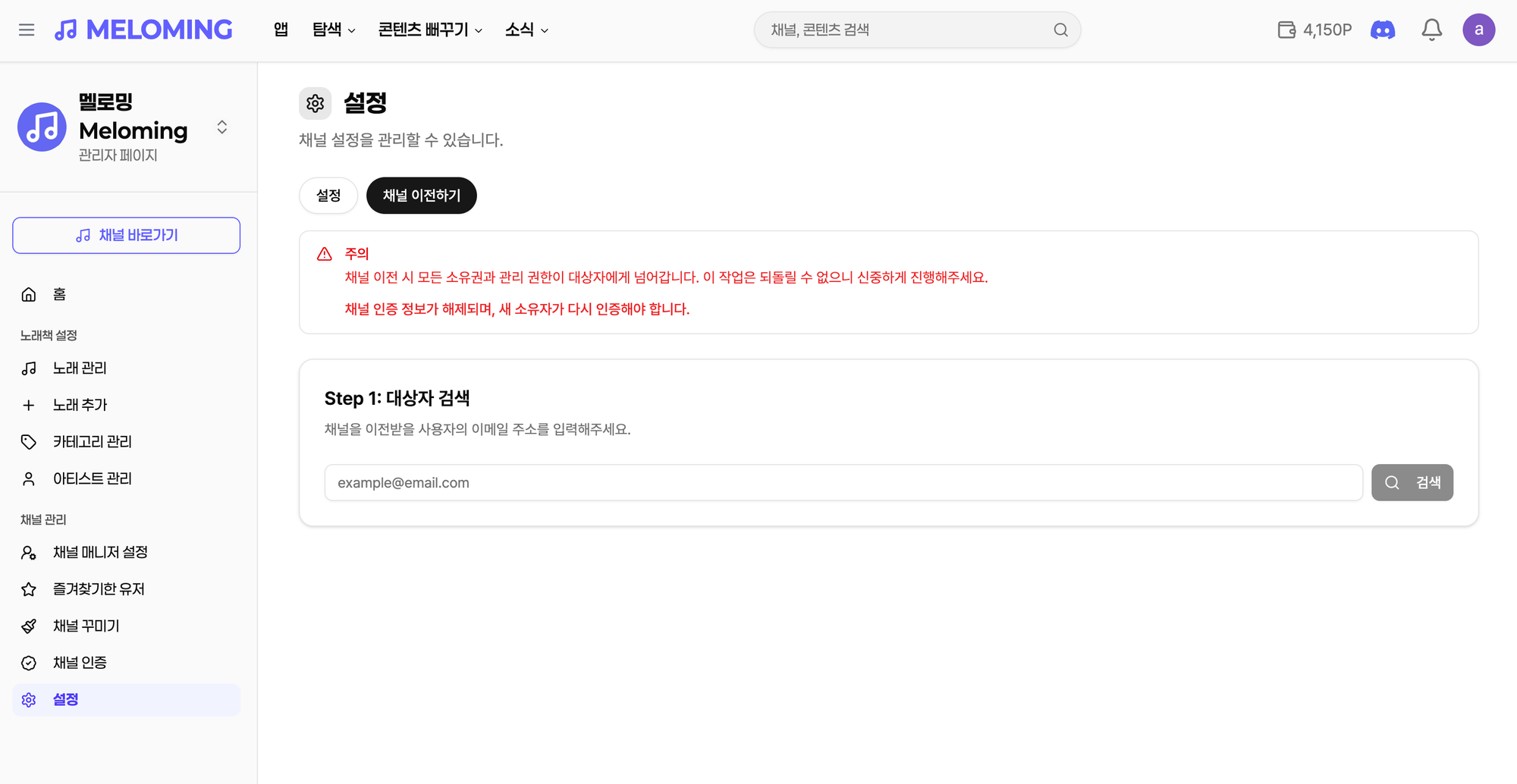 대상자 검색 메뉴에서 이전받을 스트리머의 이메일 주소를 입력해주세요. (이전받을 스트리머는 멜로밍 회원이어야합니다. 미리 회원가입을 완료한 뒤, 어떤 계정으로 가입했는지 스트리머에게 확인해주세요)
