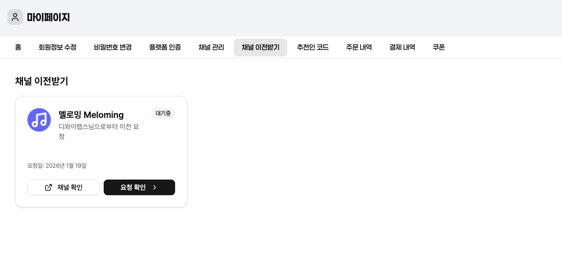 마이페이지의 '채널 이전받기' 메뉴에서 현재 요청받은 채널 이전 건을 확인할 수 있습니다.