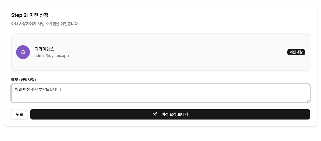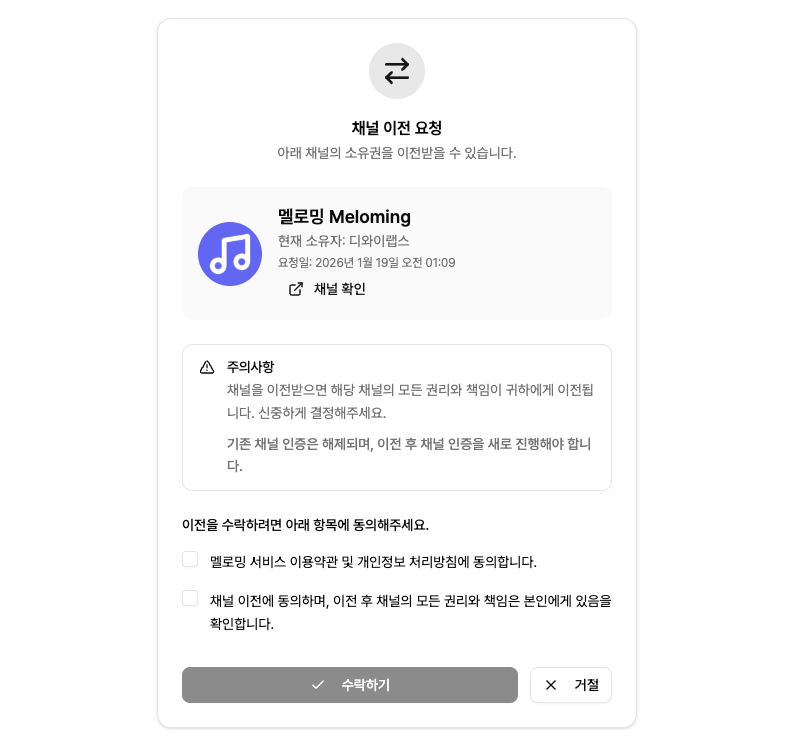 마이페이지에서 요청을 확인하거나, 이메일로 온 링크를 클릭하면 아래 '채널 이전 요청' 페이지로 바로 이동할 수 있습니다.