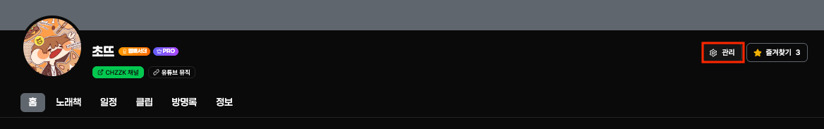 - 채널상단 관리버튼 클릭하여 관리 페이지로 이동