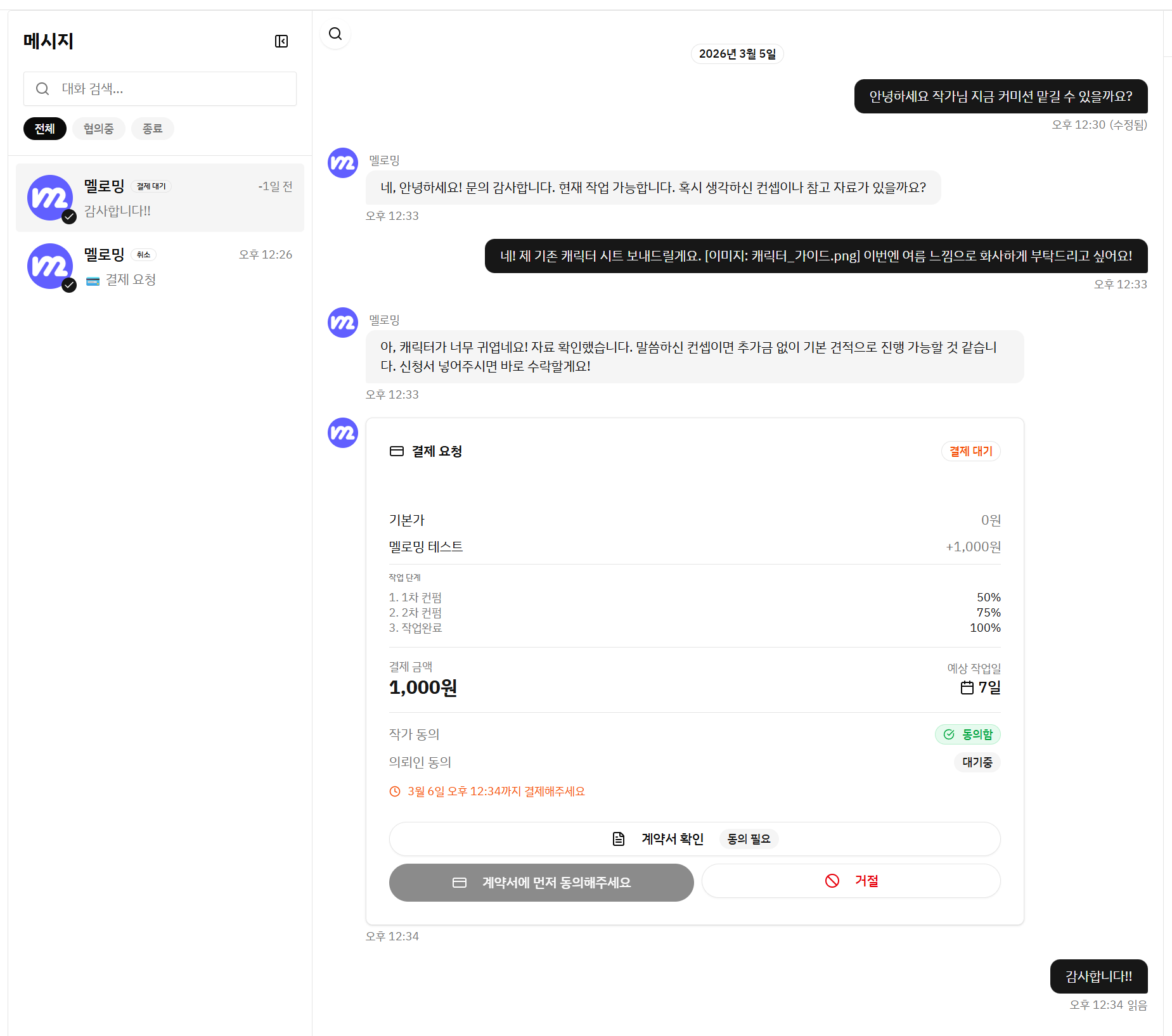 3. 플랫폼 내 실시간 채팅 지원: 문의,상담, 결제 요청까지 멜로밍 안에서 빠르고 간편하게 해결하세요.