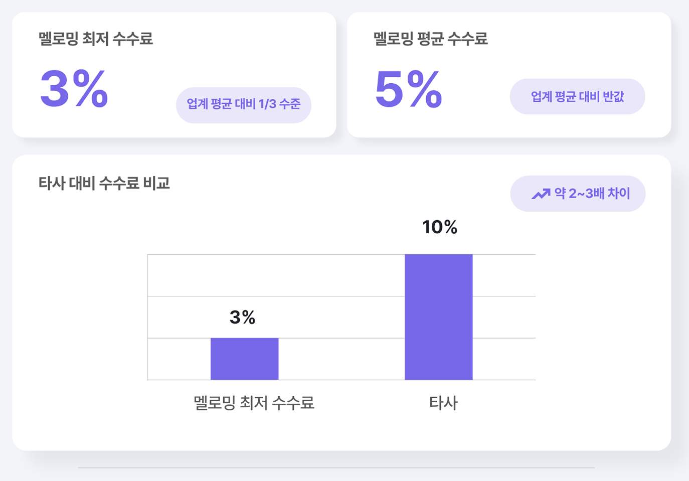 - 압도적인 수수료 혜택: 플랫폼 수수료 최저 3%, 평균 **5%**대의 파격적인 정책을 유지합니다.