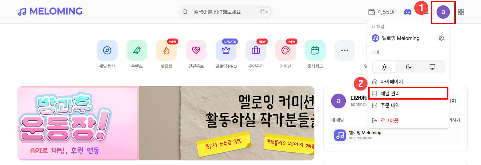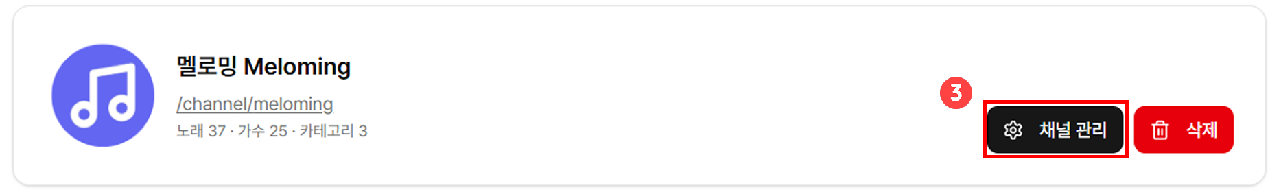 - 경로: [ 멜로밍 홈 > 우측 상단 프로필 클릭 > 채널 관리 > 채널 관리 한번 더 ]