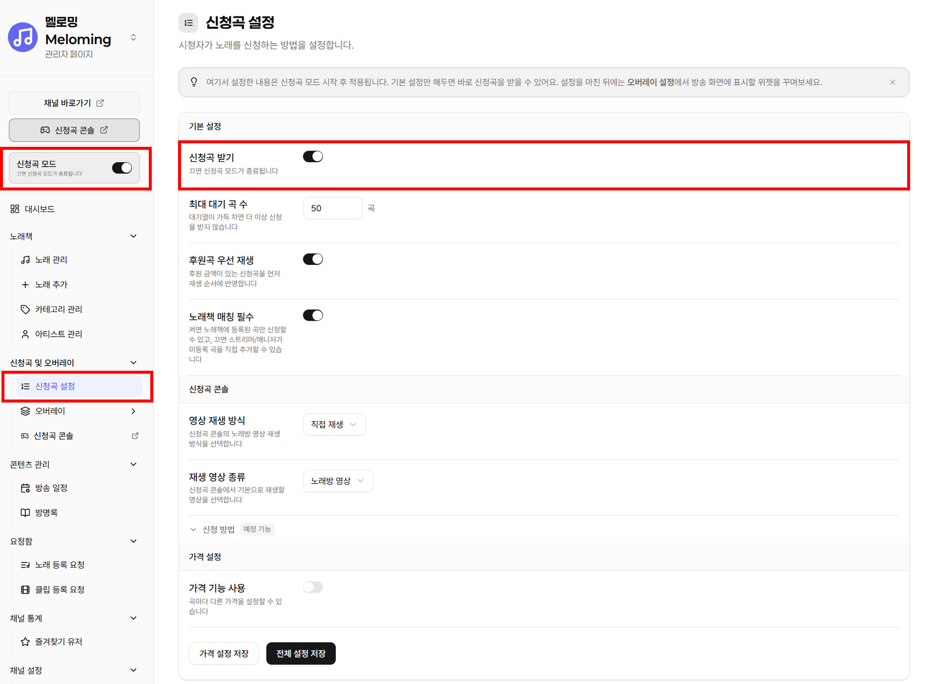 🛠️ 2단계: 신청곡 모드 활성화 및 세부 설정