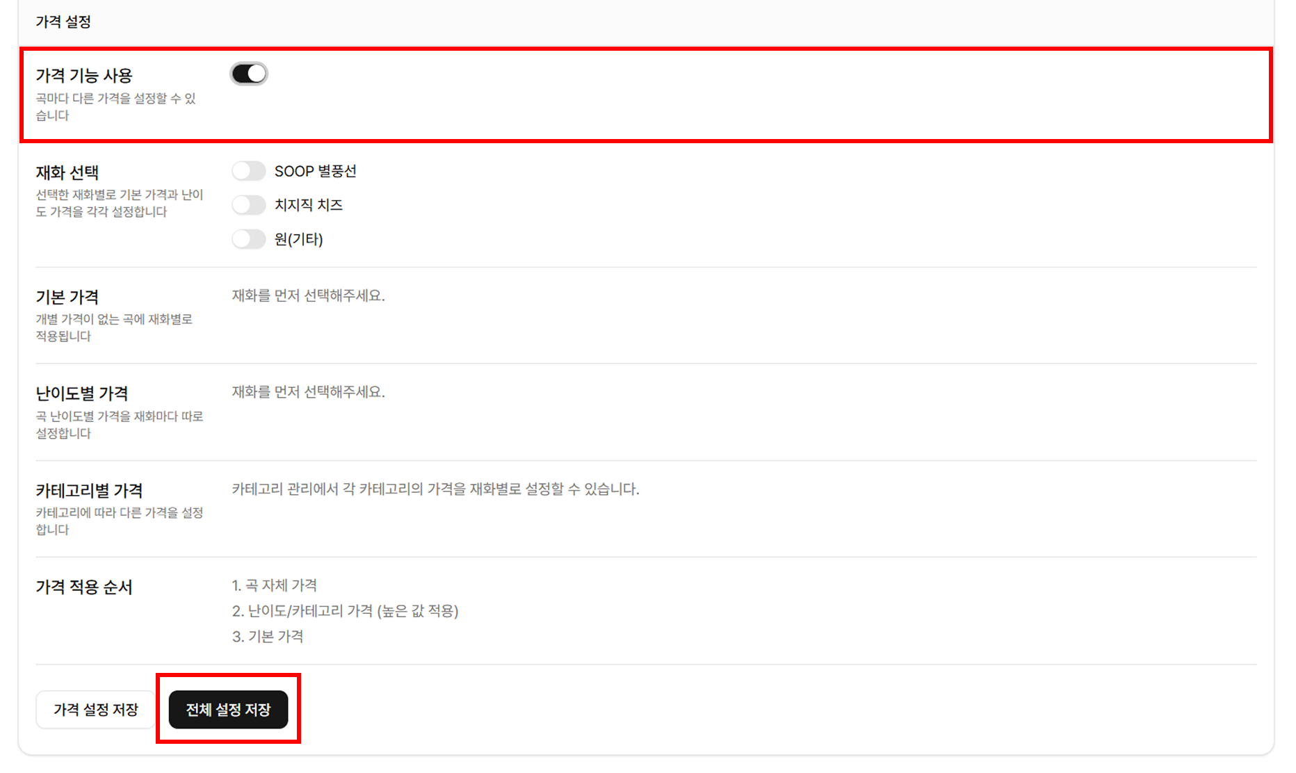 - 가격 기능: 가격 기능을 활성화 하면 신청곡의 기본 가격과 노래의 별점(난이도)이나 카테고리에 따라 가격을 다르게 책정할 수 있습니다! (가격 기능은 현재 점검중입니다! 조금만 기다려 주시면 감사하겠습니다!)