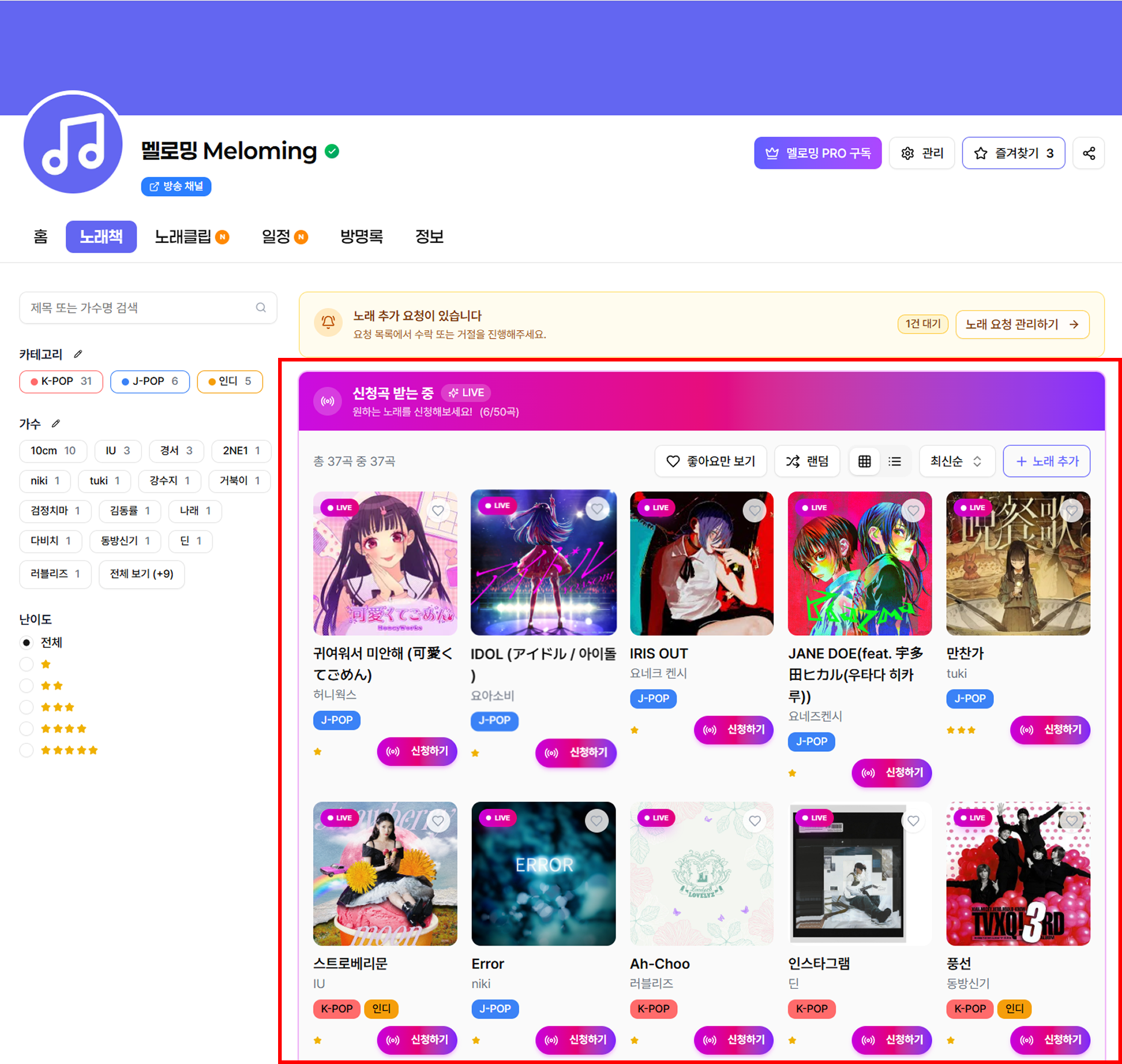 - 신청곡 모드를 켜면 내 노래책 페이지가 시청자들이 직접 '신청하기' 버튼을 눌러 곡을 요청할 수 있는 화면으로 자동 전환됩니다!