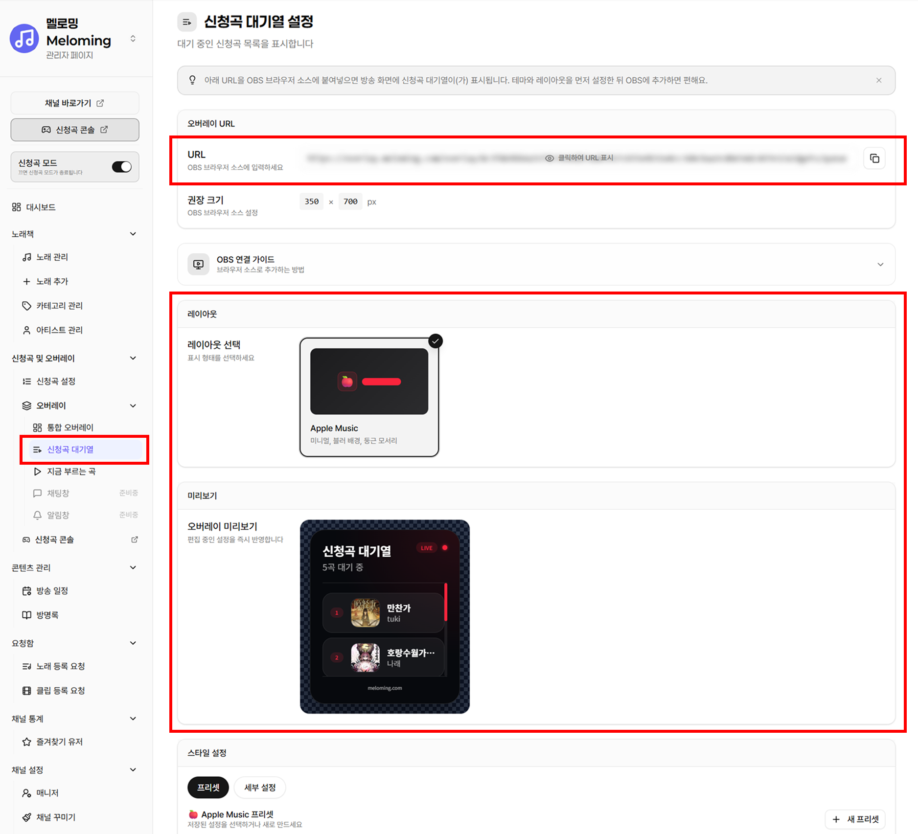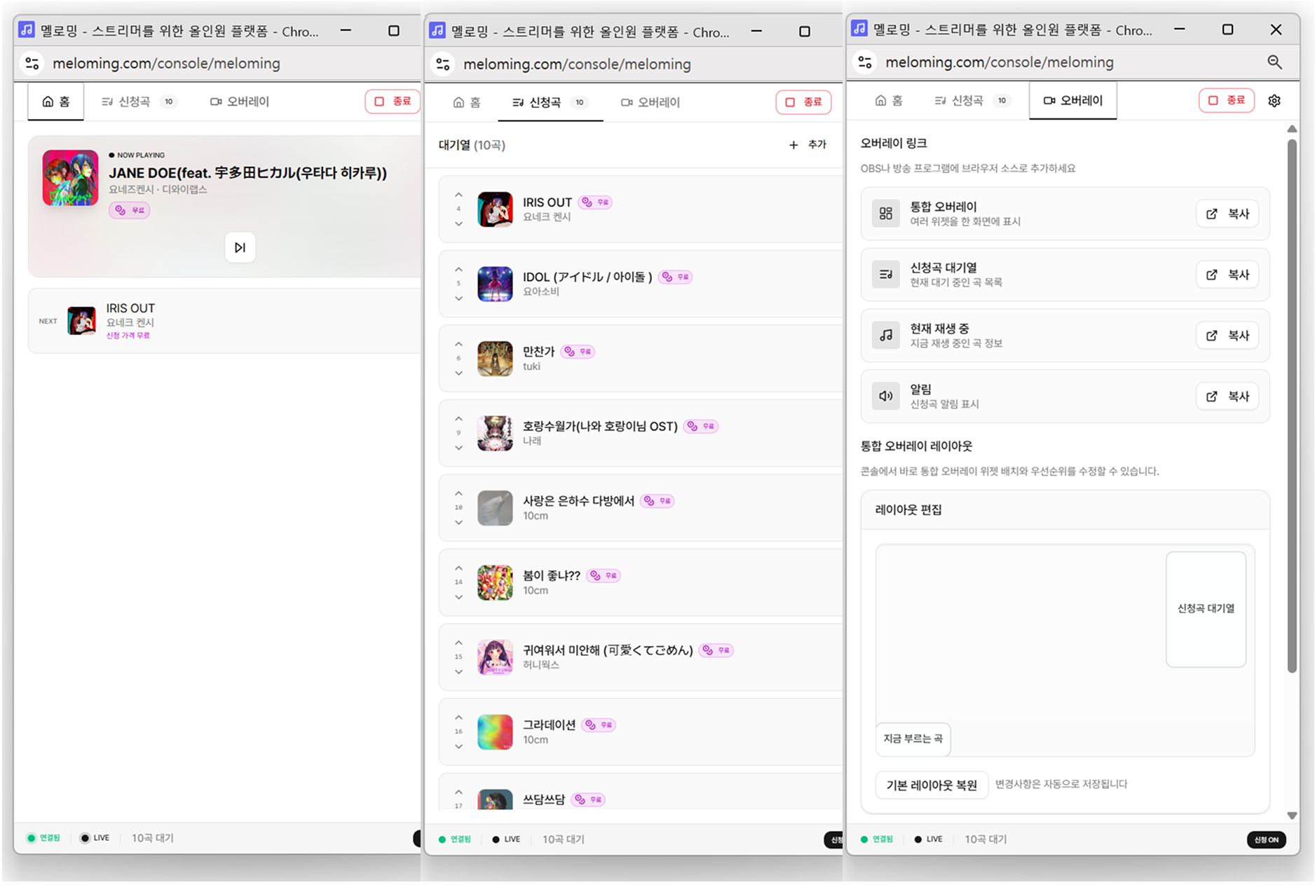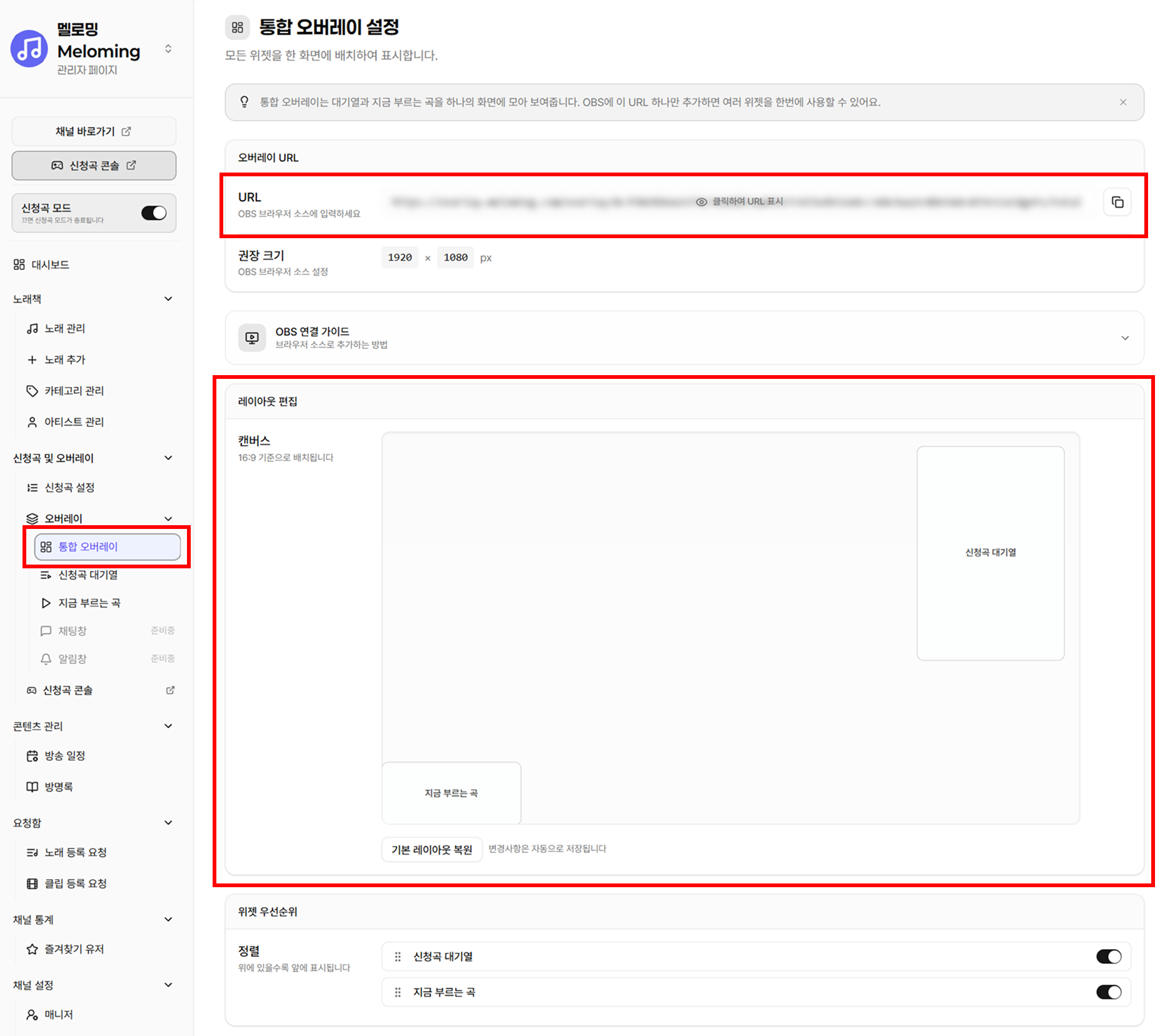 - 설명: '신청곡 대기열'과 '지금 부르는 곡' 위젯을 통합해서 사용할 수도 있지만, 각각의 설정 페이지에서 레이아웃 설정 및 개별적으로 화면에 띄우는 것도 가능합니다.