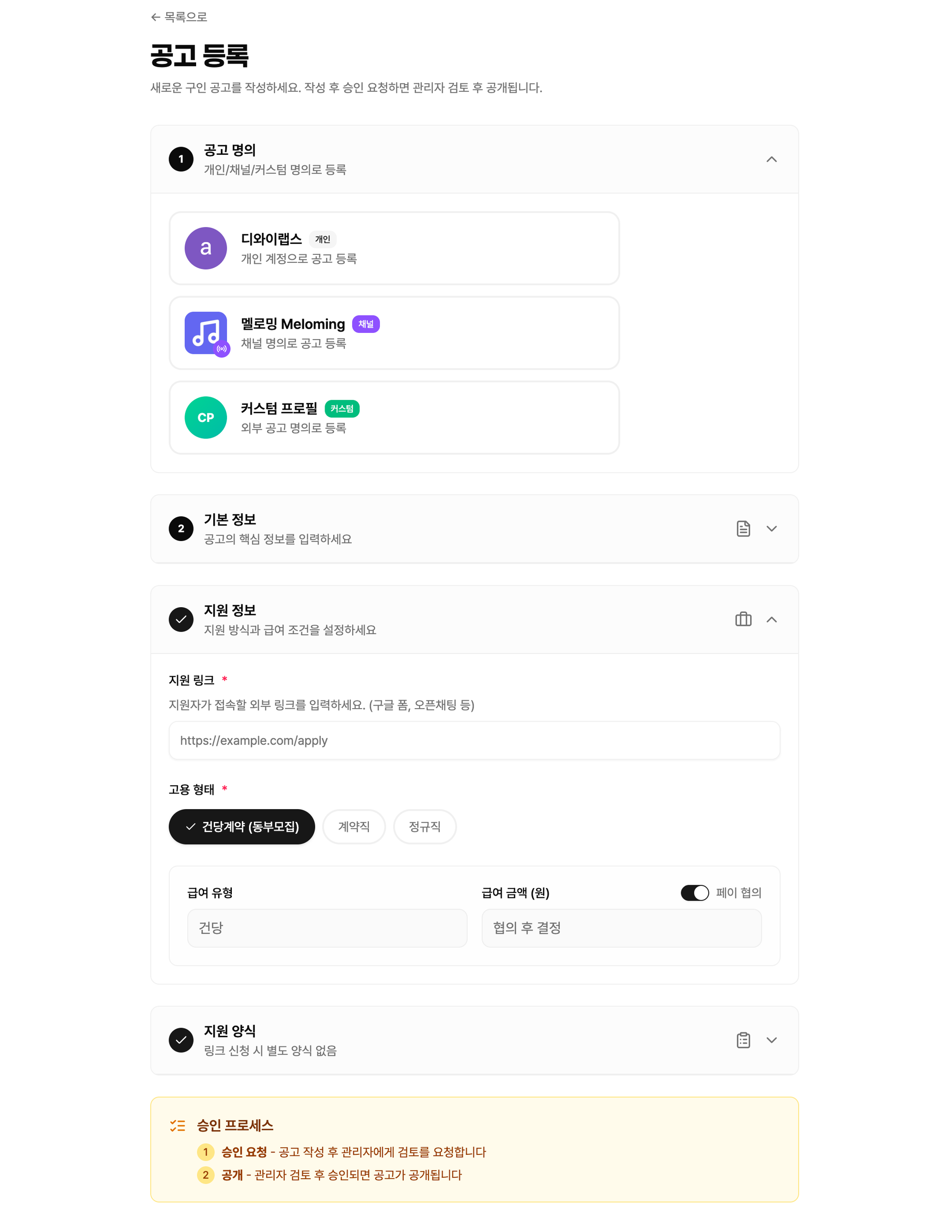 - 지원 정보에 지원 링크와 고용 형태(건당계약(동부모집)·계약직·정규직), 급여(협의 가능)를 설정합니다.
