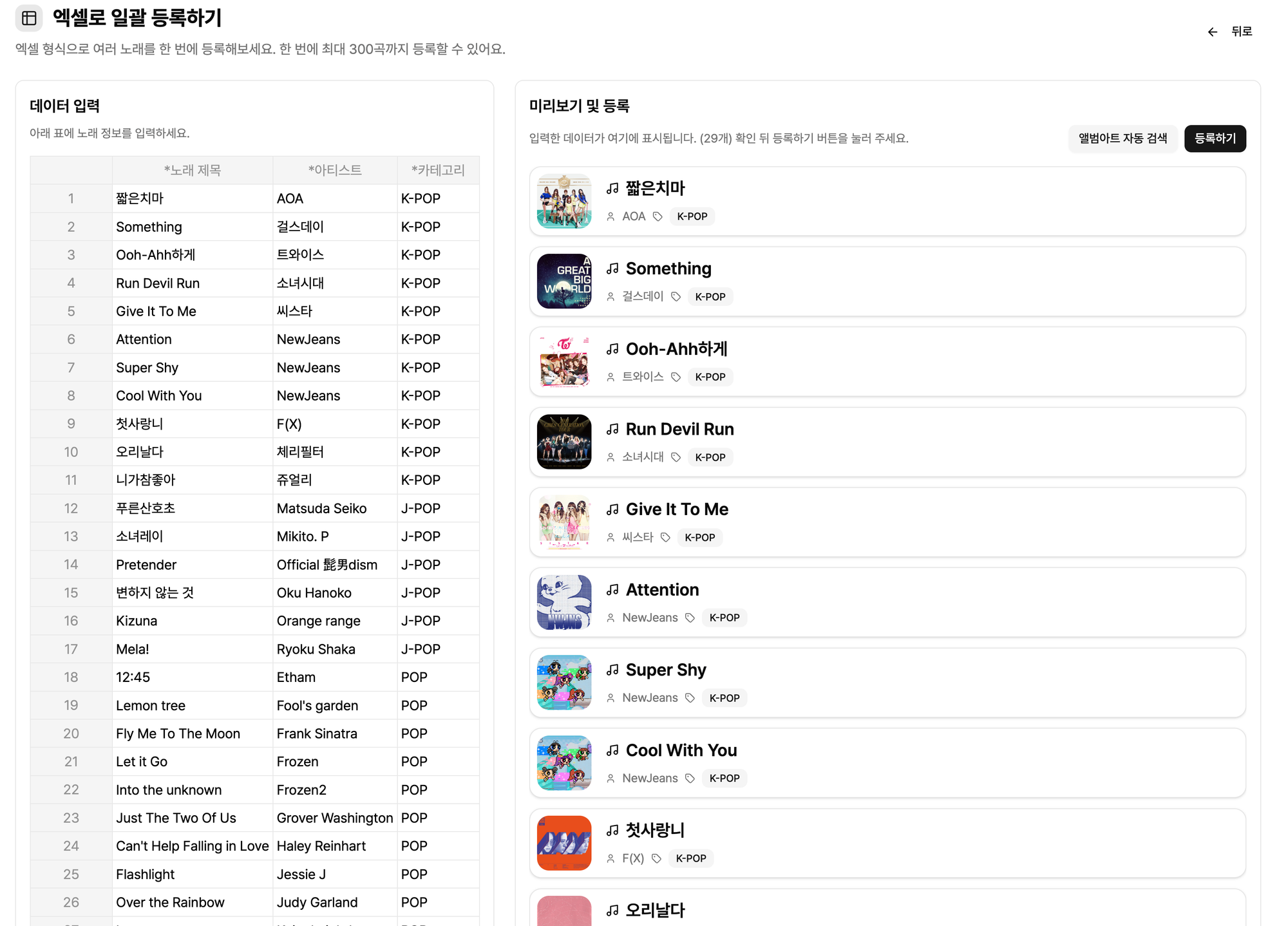 입력한 뒤에는 우측 '미리보기 및 등록' 화면에서 등록될 노래 목록을 미리볼 수 있습니다.