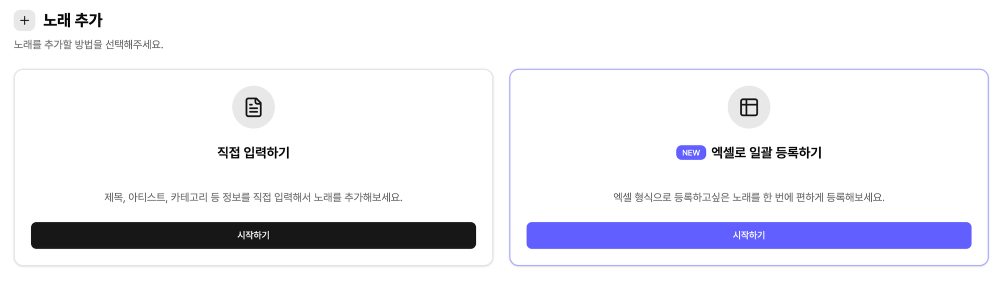 노래 추가 페이지에서 '엑셀로 일괄 등록하기' 를 누르면 엑셀 형식으로 노래를 일괄 입력할 수 있는 화면이 뜹니다.