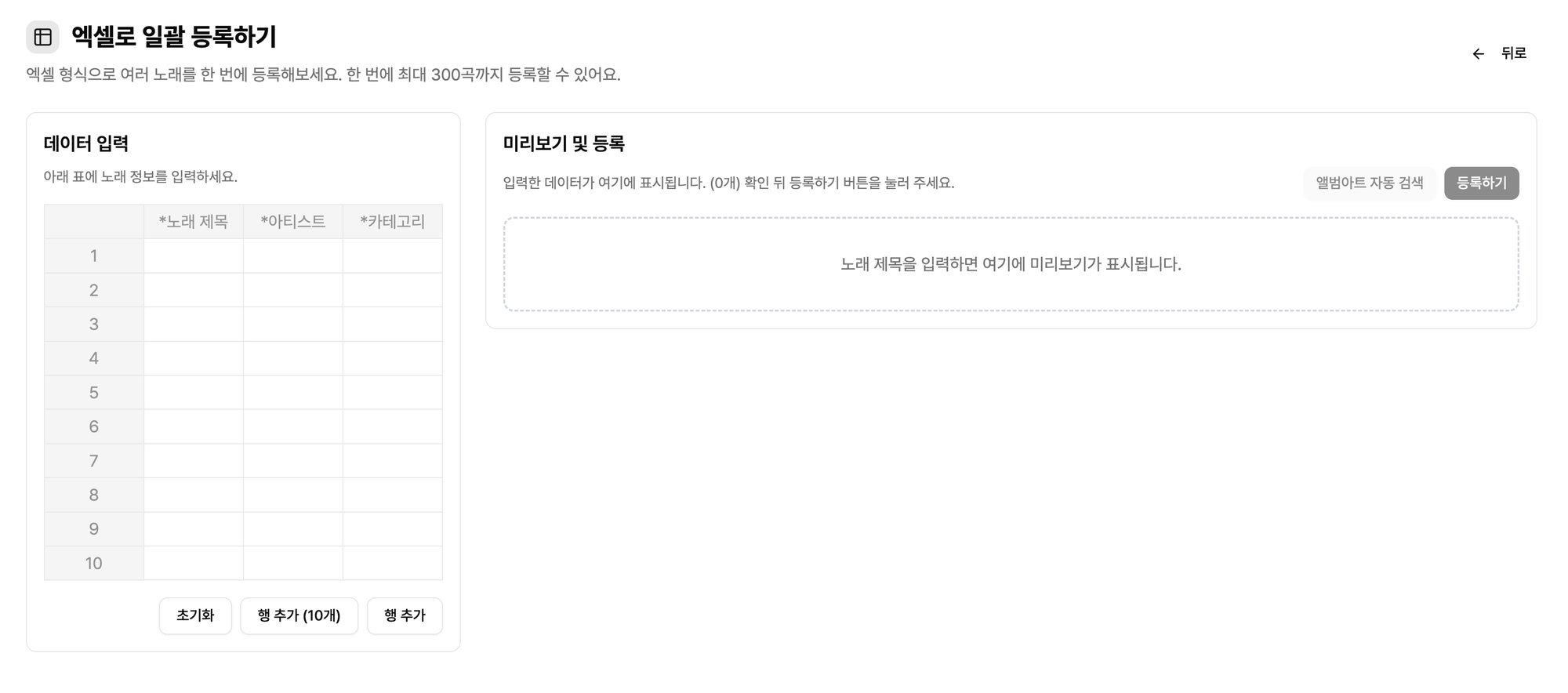 노래 등록은 한 번에 최대 300곡까지 가능하며, 노래 제목과 아티스트, 카테고리 외에 나머지 항목들은 노래 수정 페이지에서 직접 수정하실 수 있습니다.