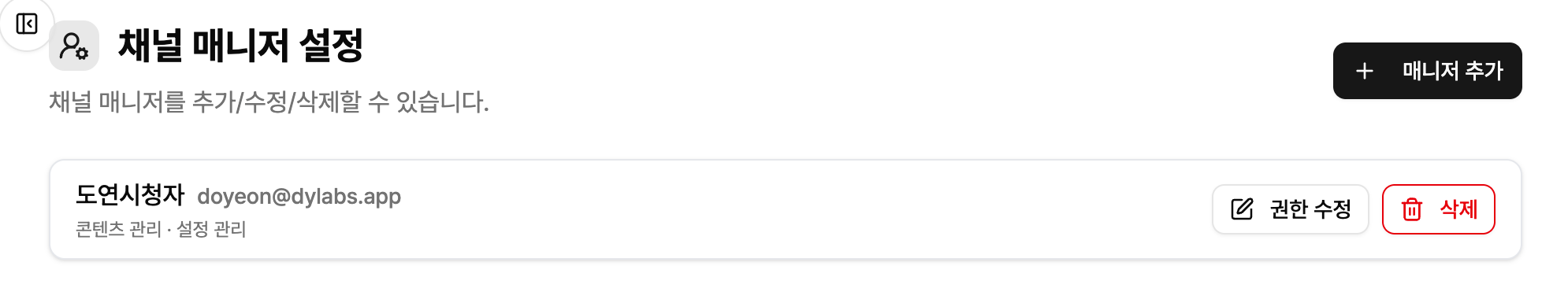 채널 매니저 기능이 추가되었습니다. 이제 스트리머가 노래책 관리를 매니저에게 위임할 수 있고, 매니저가 직접 노래를 추가하거나 수정/삭제할 수 있습니다.