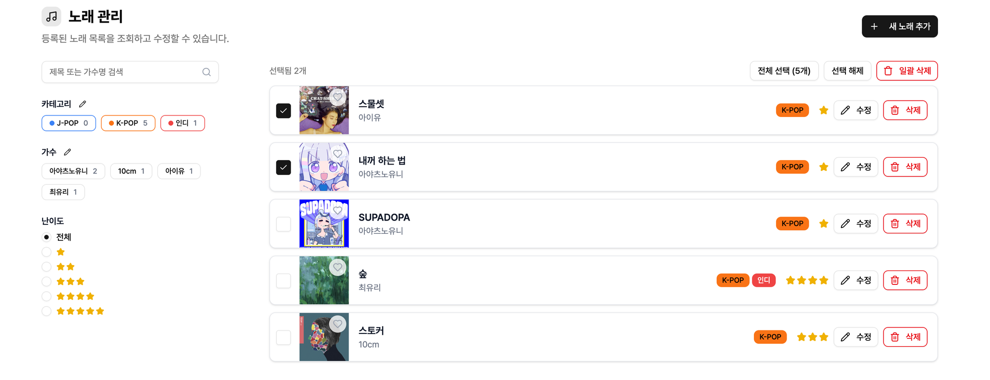 이제 채널 관리 페이지에서 노래를 더 쉽게 관리할 수 있습니다. 기존에 노래책 페이지에만 존재하던 필터 기능이 추가되었고, 여러 항목을 선택해 일괄 삭제도 가능합니다.