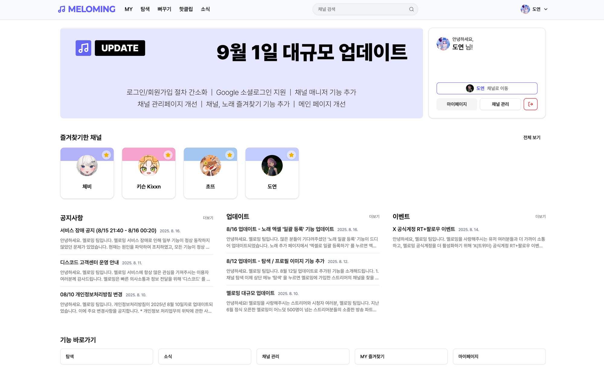 로그인 후 방문할 수 있는 '메인 페이지'가 개편되었습니다. 이제 서비스에 대한 안내사항부터, 즐겨찾기한 채널, 마이페이지, 채널 관리 등 기능으로 쉽게 접속할 수 있습니다.
