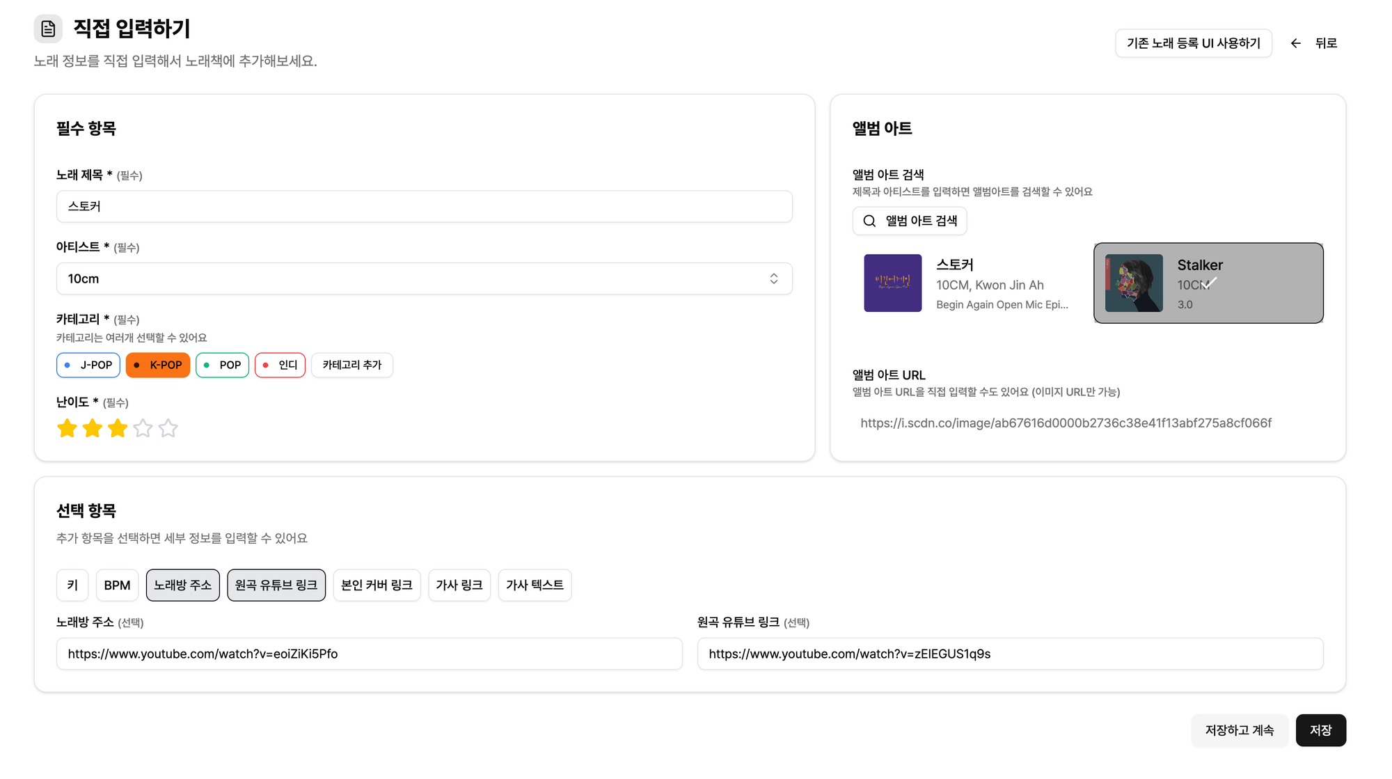 기존에 노래 등록 UI가 불편하고, 입력해야 할 내용이 많다는 피드백이 많이 있었습니다. 이번 UI 개선을 통해 '필수 항목' 과 '선택 항목' 이 명확히 구분되었고, 앨범 아트도 제목과 아티스트 선택시 바로 검색되어 더 편하게 노래를 등록할 수 있게 되었습니다. 특히 선택 항목의 경우 필요한 항목만 골라서 등록할 수 있어 더 직관적으로 변하였습니다.