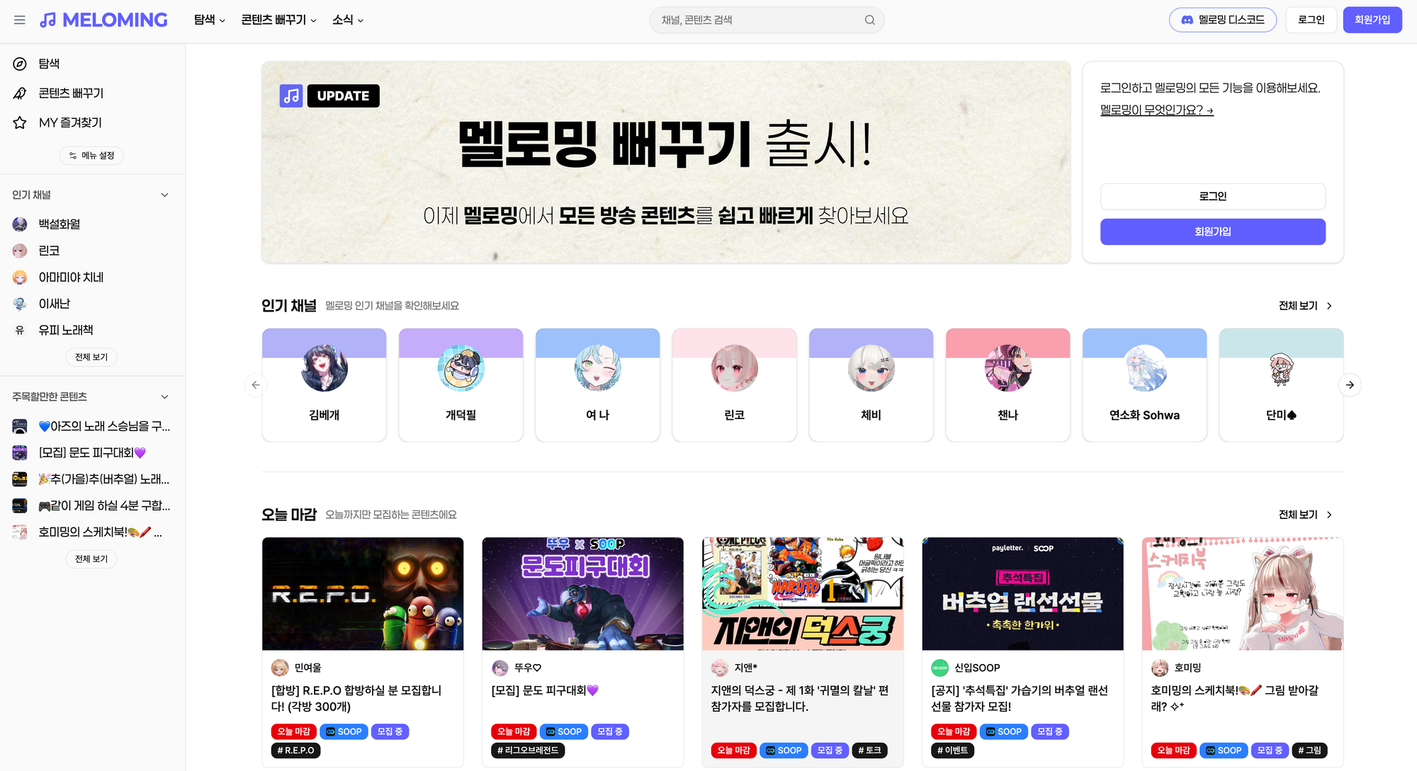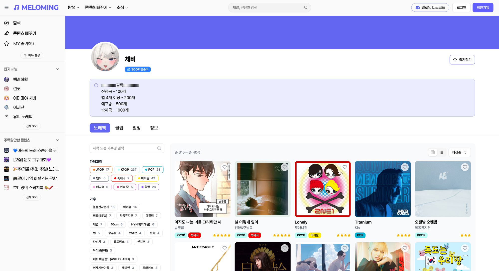 사이드바를 통해 인기 채널과 주요 콘텐츠들을 쉽게 찾아볼 수 있게 되었습니다. 또, 즐겨찾기를 해둔 스트리머의 경우 사이드바를 통해 빠르게 노래책을 찾아볼 수 있게 되었습니다. 이를 통해 멜로밍에서 제공하는 모든 기능으로 필요할 때마다 더 빠르게 이동할 수 있게 되었습니다.