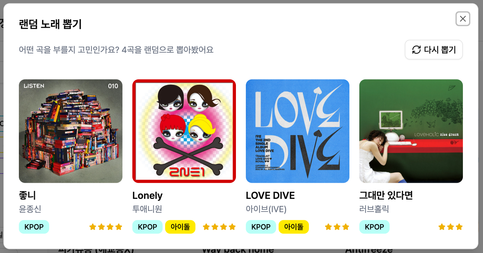 어떤 곡을 부를지, 또 어떤 곡을 신청할지 고민이 많으셨나요? 이제 랜덤 뽑기 기능이 노래책에 추가되었어요. 노래책에서 랜덤으로 곡을 뽑아서 보여주고, '다시 뽑기' 버튼을 통해 새로운 곡을 탐색할 수도 있어요.