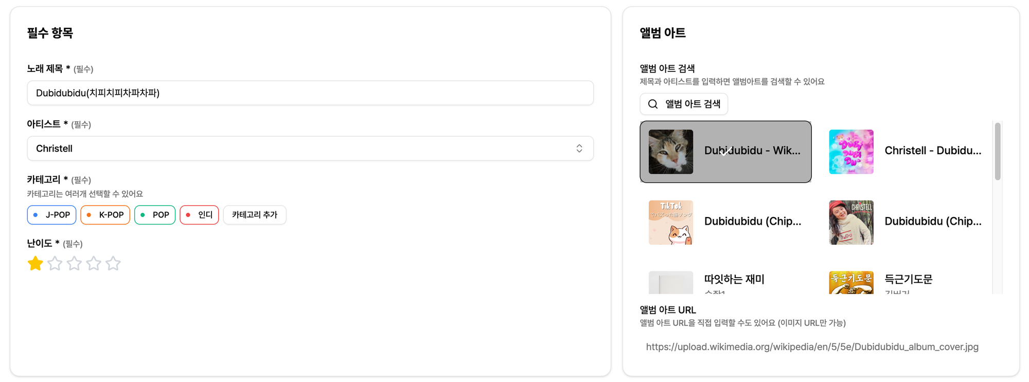 이번에 Google 이미지 검색 API를 추가로 연동하여 더 적절한 이미지를 찾고 선택할 수 있도록 개선하였습니다. 만일 등록하려는 노래에 앨범 아트가 잘 검색되지 않을 경우, 구글 검색하듯 노래 제목을 조금 변경하여 검색해보는 걸 추천드립니다!
