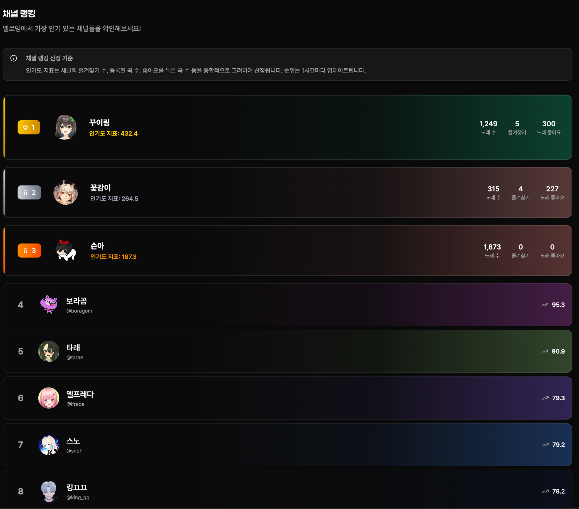 랭킹은 스트리머가 등록한 노래 수, 채널 즐겨찾기 수, 노래 좋아요 수를 종합적으로