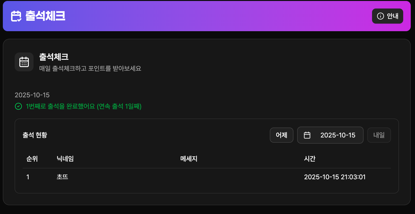 출석 체크를 완료한 순서대로 순위가 정해져 페이지 상단에 노출됩니다.