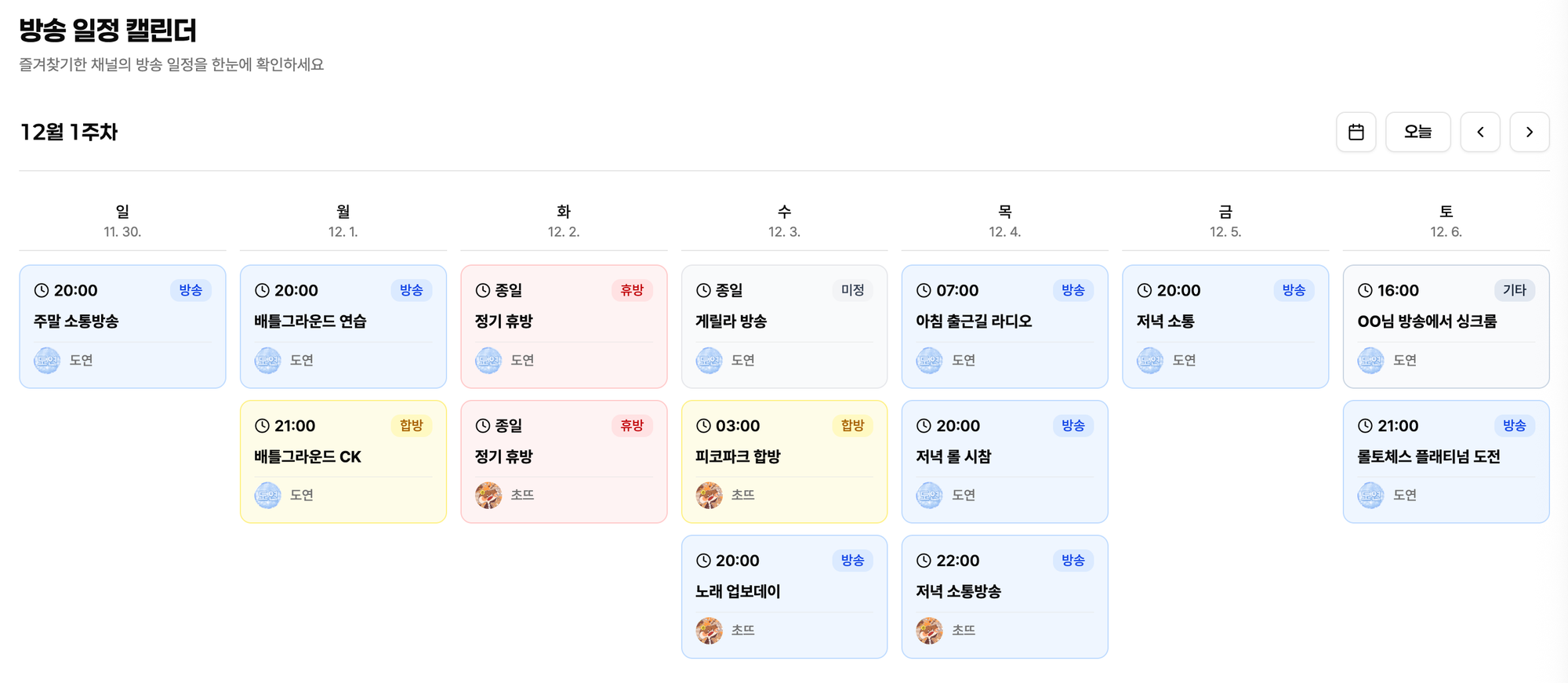 'MY 즐겨찾기 > 방송 일정 캘린더' 메뉴에서 내가 즐겨찾기한 스트리머의 방송 일정을 한 눈에 확인할 수 있어요!