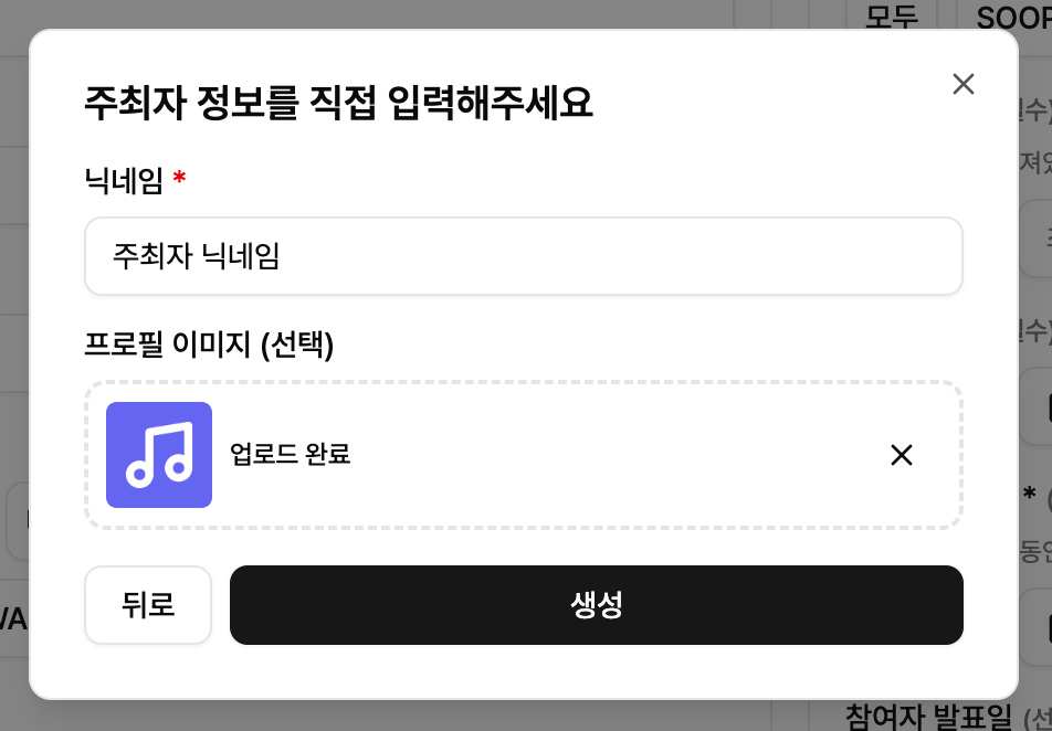 기존에는 주최자 등록시 SOOP, 치지직 채널이 있어야만 등록이 가능했는데요, 이번 업데이트를 통해 직접 닉네임과 프로필 이미지를 선택해 주최자를 등록할 수 있게 되었어요.