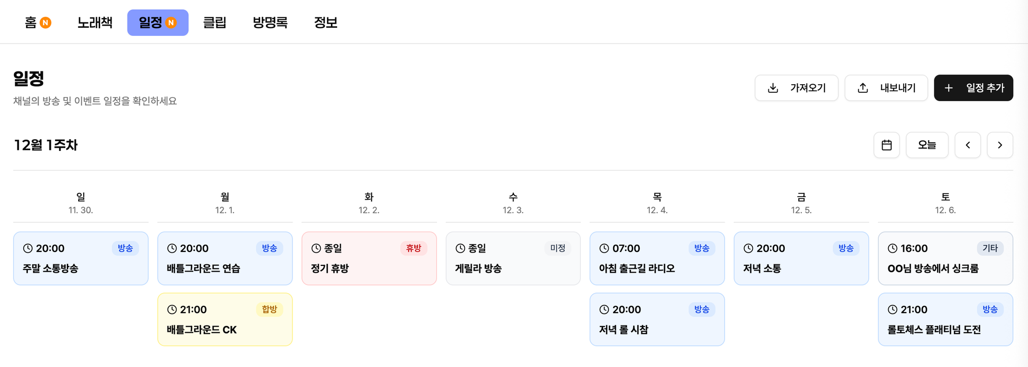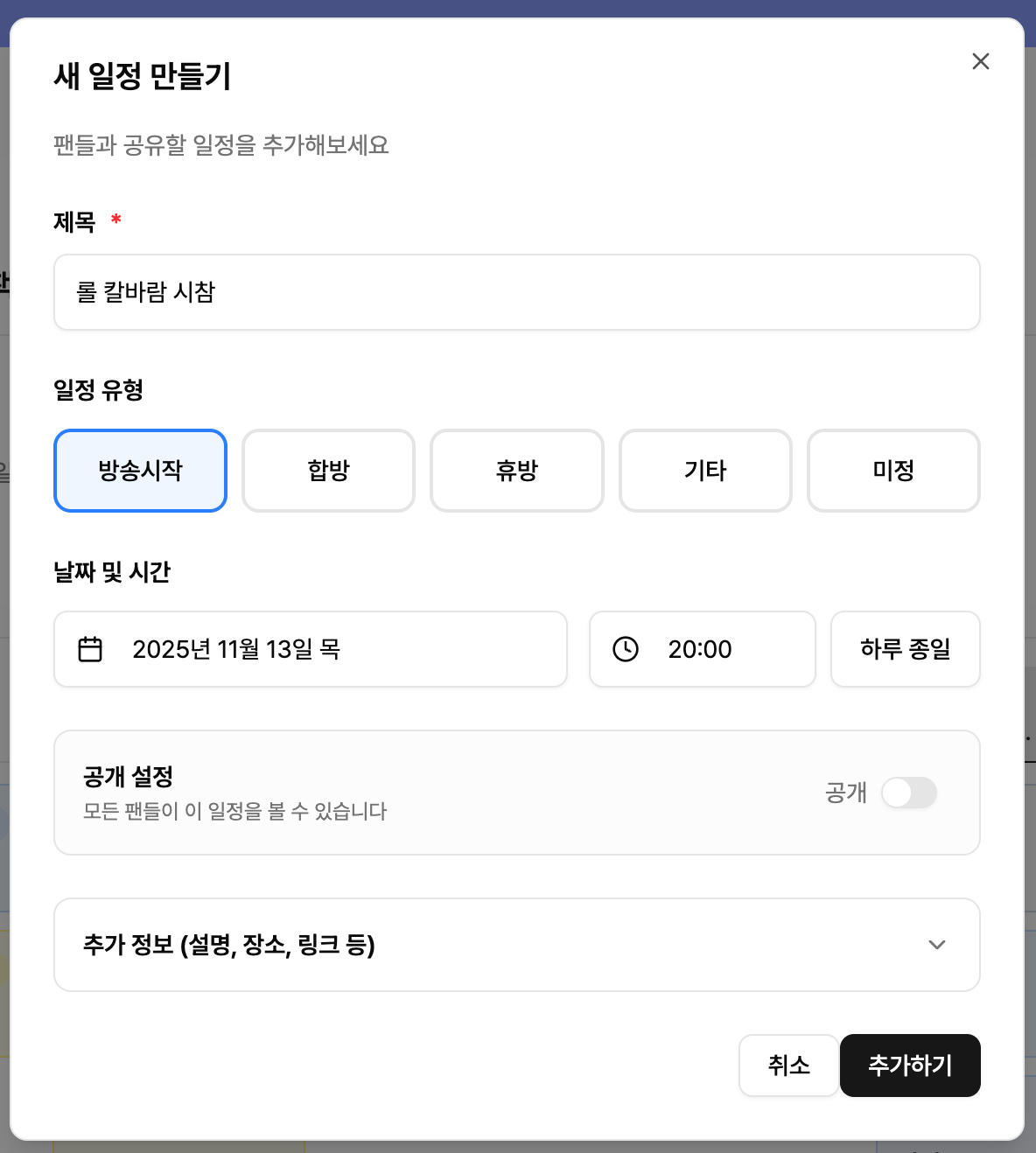 그리고 스트리머는 '일정 추가' 버튼을 눌러 제목, 일정 유형, 날짜와 시간을 입력하여 팬들에게 방송 일정을 공유할 수 있어요.